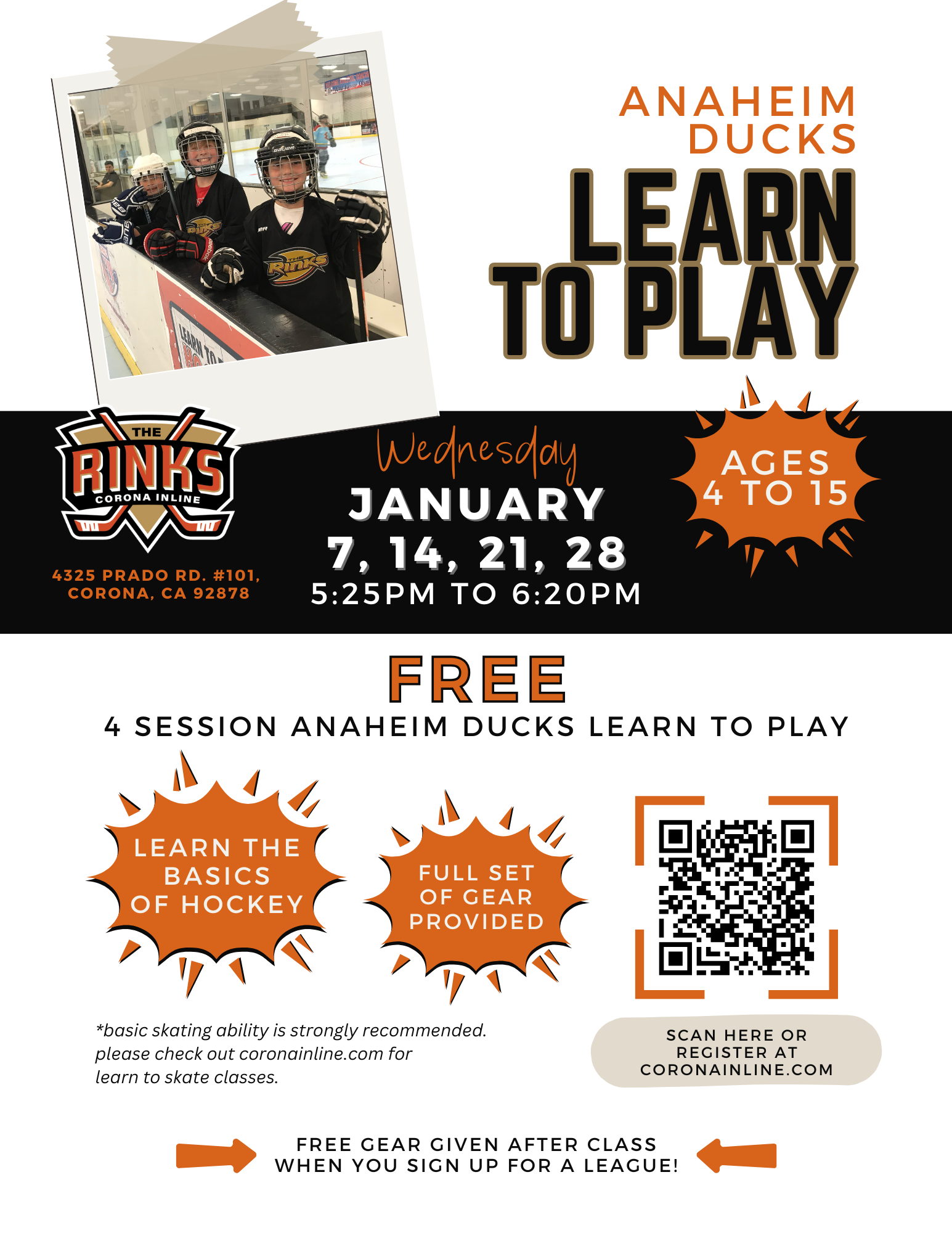 The current sessions will be held January 7th, 14th, 21st & 28th 2026. Sessions are 5:25pm-6:20pm. All gear is provided for this FREE four week session sponsored by the Anaheim Ducks and held at Corona Inline.