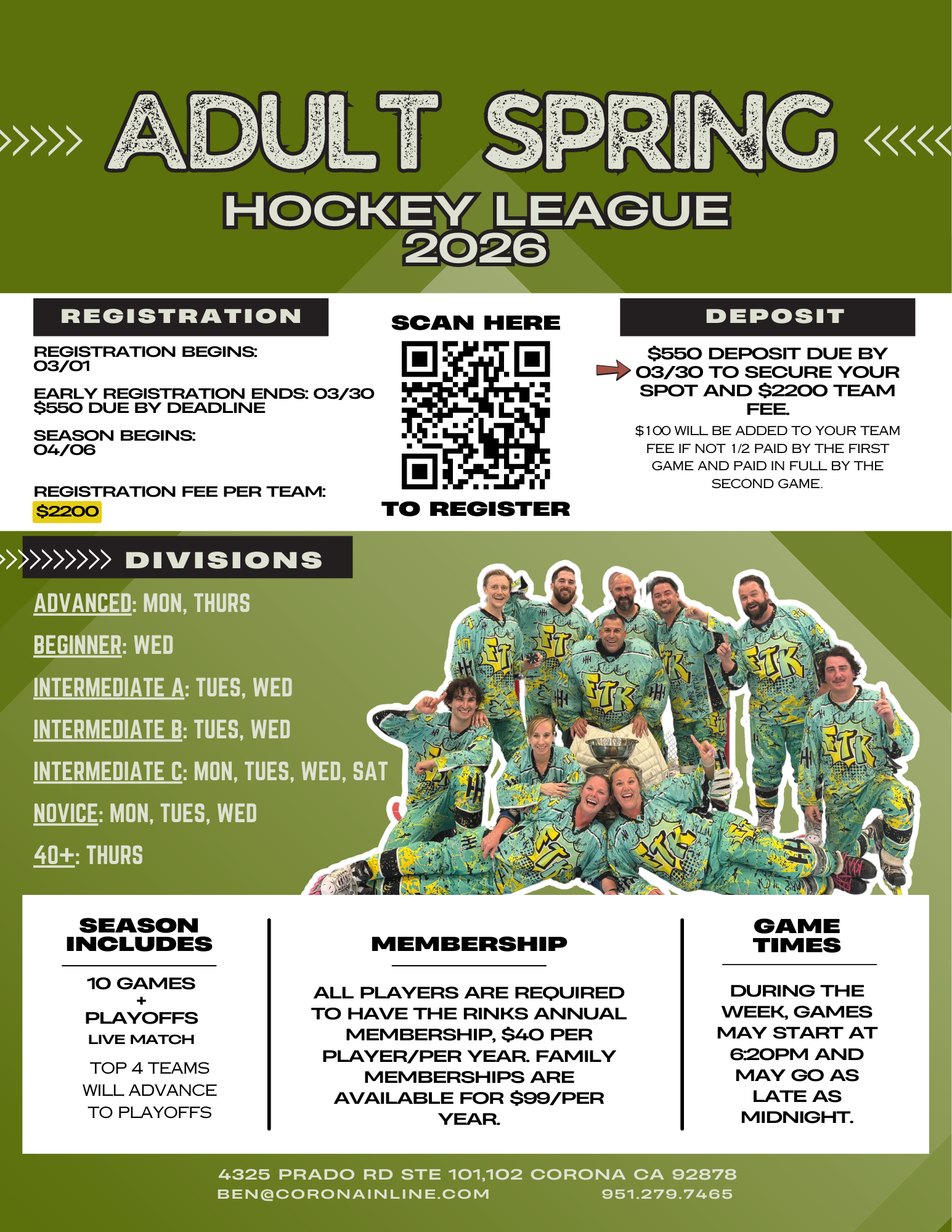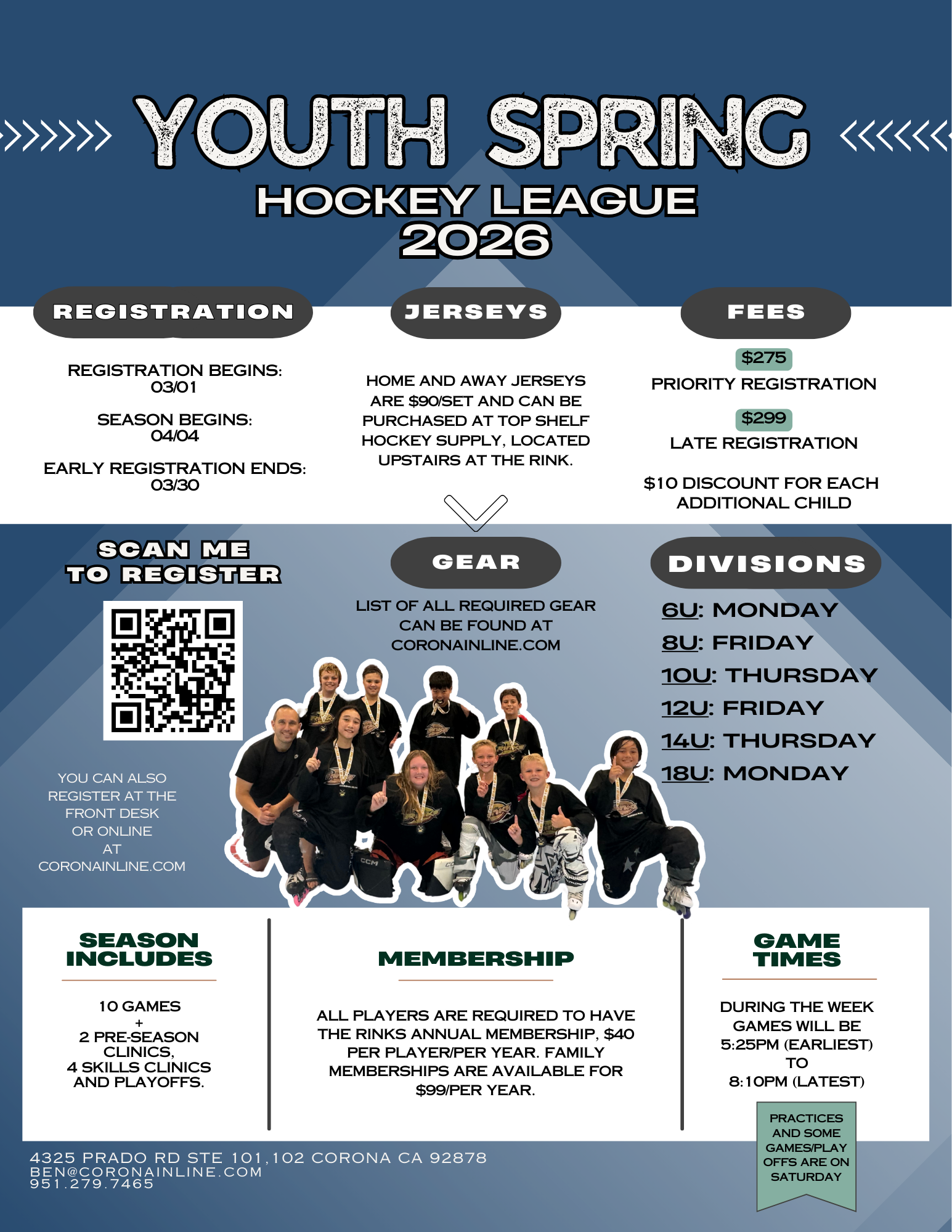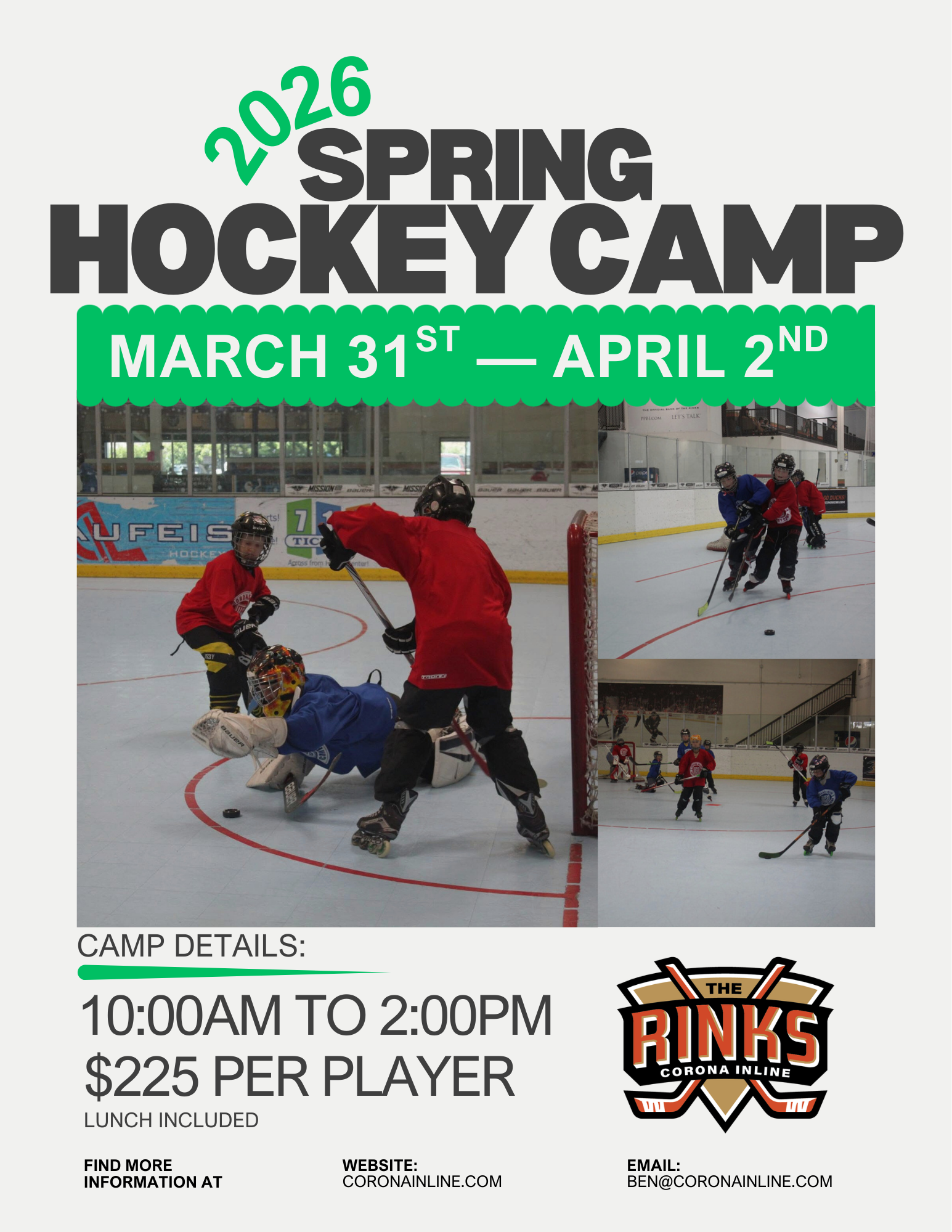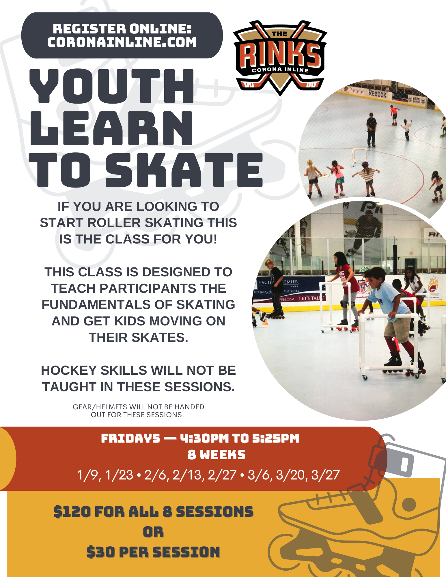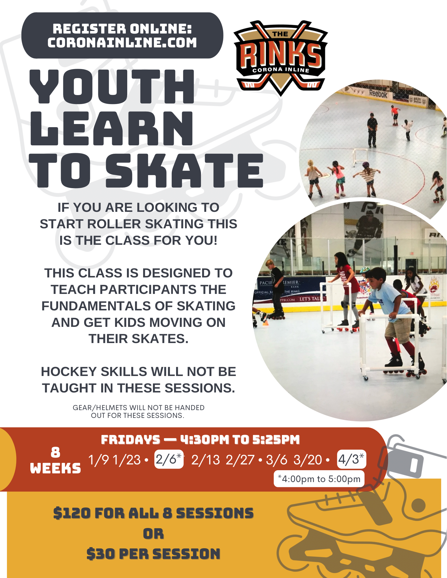 The current sessions will be held March 4, 11, 18, and 26th, 2026. Sessions are 5:25pm-6:20pm. All gear is provided for this FREE four week session sponsored by the Anaheim Ducks and held at Corona Inline.