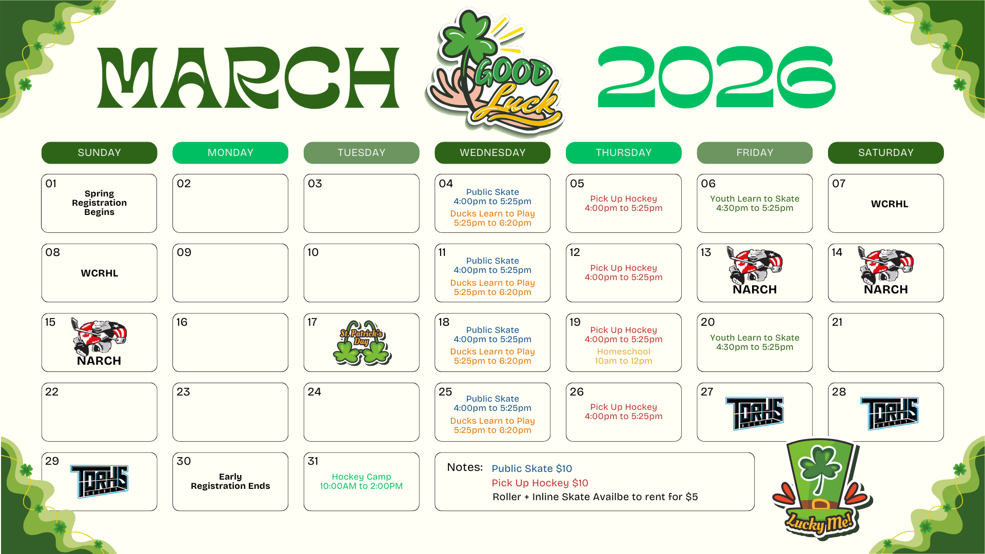 Public skating, and pick up hockey are $10 each for admission. Skates can be rented for $5 a pair. View our calendar below for more information on dates and times.